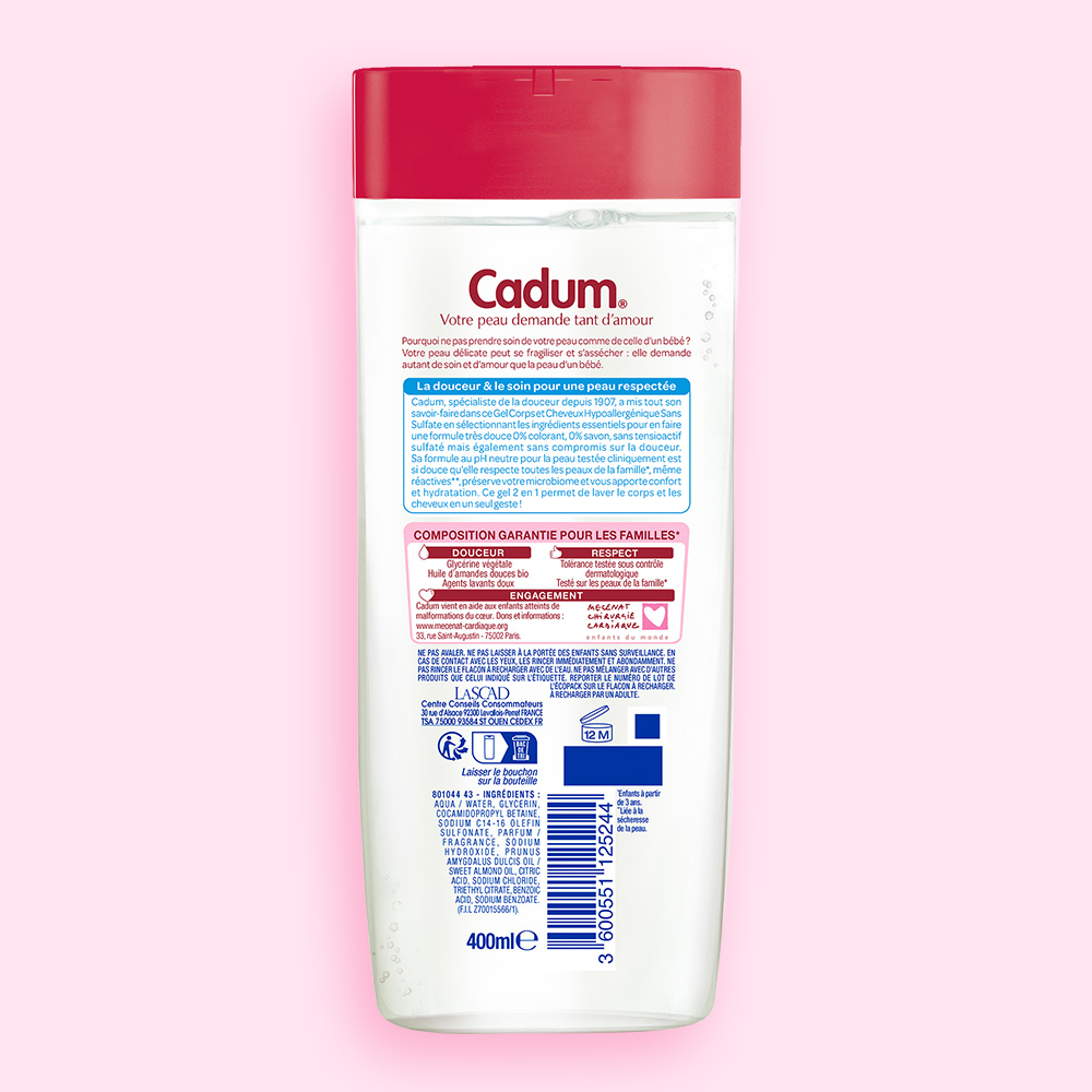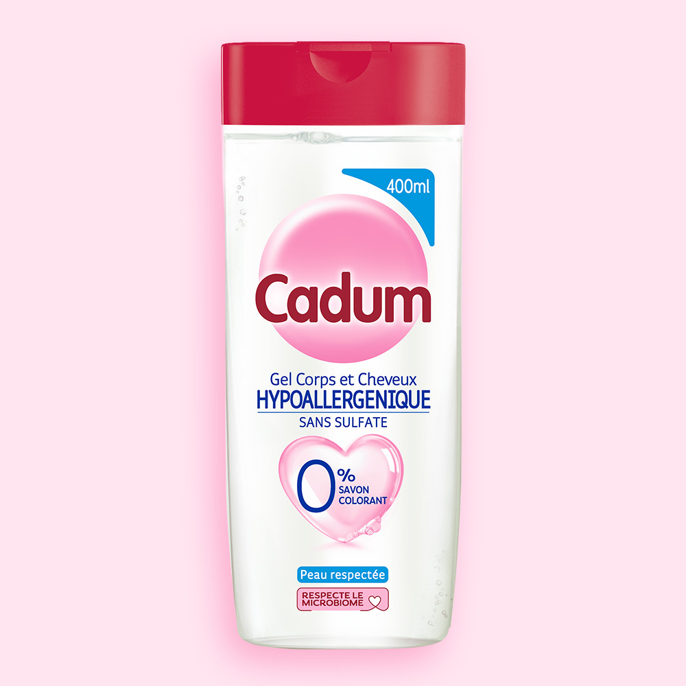 - Cadum, spécialiste de la douceur depuis 1907, a mis tout son savoir-faire dans ce Gel Corps et Cheveux Hypoallergénique Sans Sulfate en sélectionnant les ingrédients essentiels pour en faire une formule très douce 0% colorant, 0% savon, sans tensioactif sulfaté mais également sans compromis sur la douceur. Sa formule au pH neutre testée cliniquement est si douce qu'elle respecte toutes les peaux de la famille*, même réactives**, préserve votre microbiome et vous apporte confort et hydratation. Ce gel 2 en 1 permet de laver le corps et les cheveux en un seul geste ! Tolérance testée sous contrôle dermatologique. Testé sur les peaux de la famille. *Enfants à partir de 3 ans. **Liées à la sécheresse de la peau