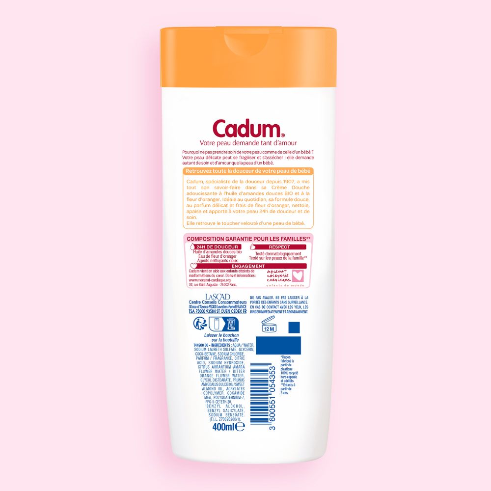 Cadum, spécialiste de la douceur depuis 1907, a mis tout son savoir-faire dans cette crème douche adoucissante à l’huile d’amandes douces bio et à la fleur d'oranger. Idéale au quotidien, sa formule douce, au parfum délicat et frais de fleur d'oranger, nettoie, apaise et apporte à votre peau 24h de douceur et de soin. Elle retrouve le toucher velouté d'une peau de bébé.