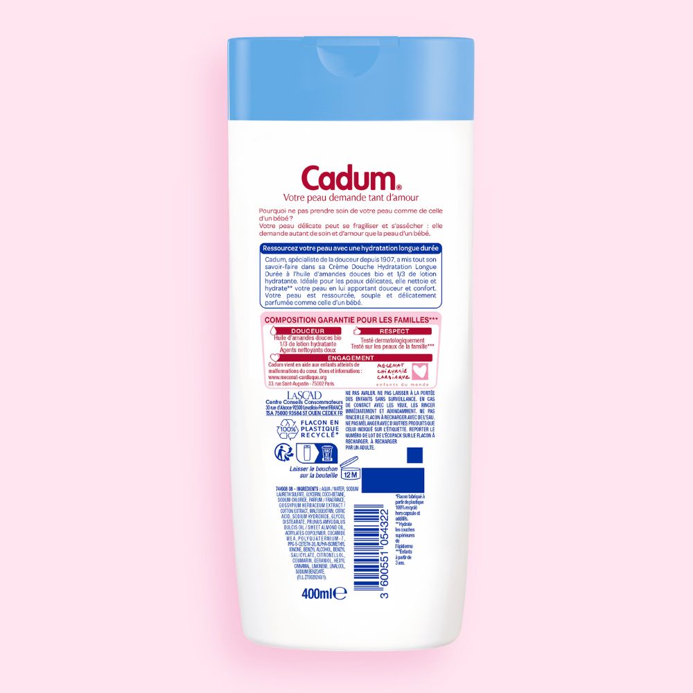 Cadum, spécialiste de la douceur depuis 1907, a mis tout son savoir-faire dans sa Crème Douche Hydratation Longue Durée à l’huile d’amandes douces bio et 1/3 de lotion hydratante. Idéale pour les peaux délicates, elle nettoie et hydrate* votre peau en lui apportant douceur et confort. Votre peau est ressourcée, souple et délicatement parfumée comme celle d’un bébé.