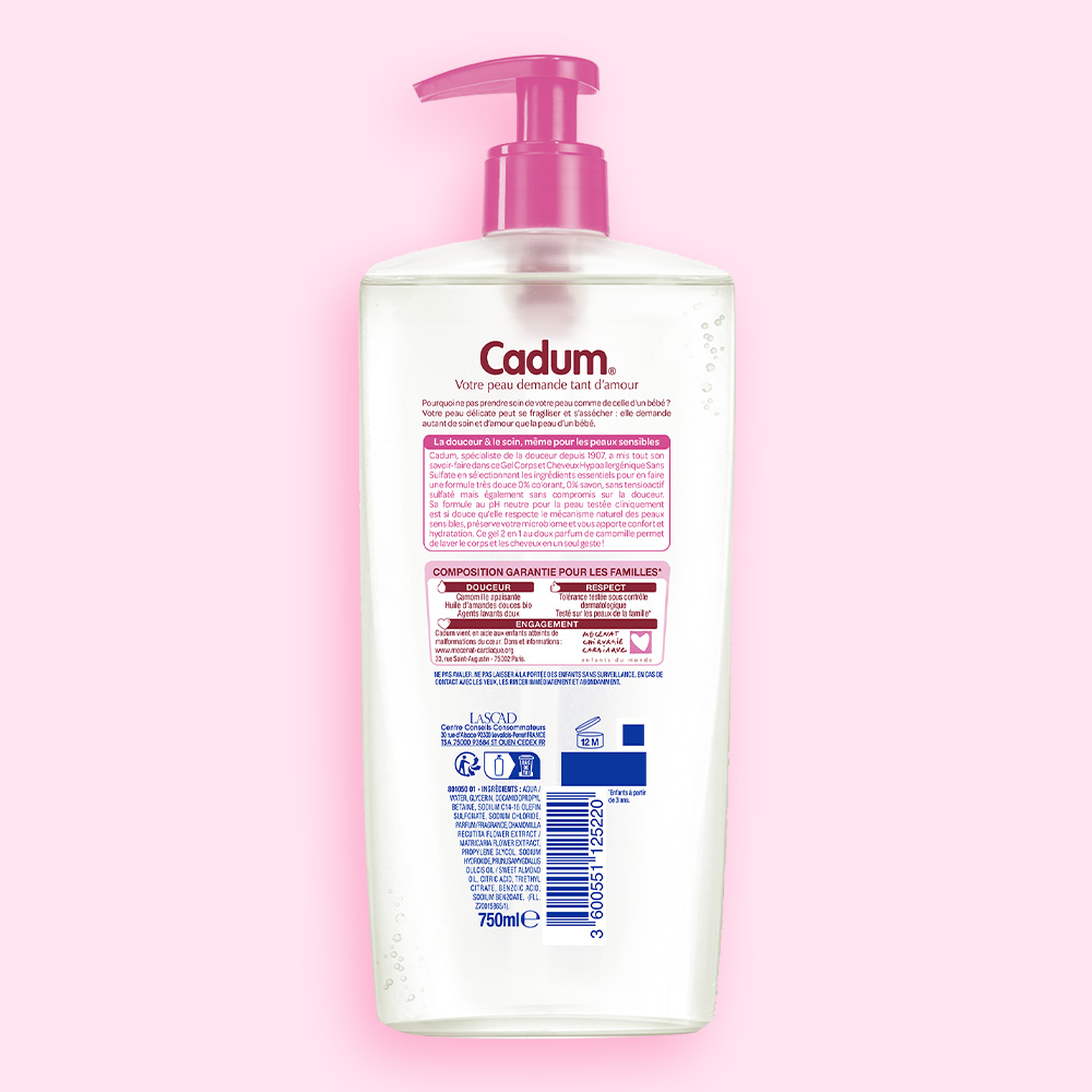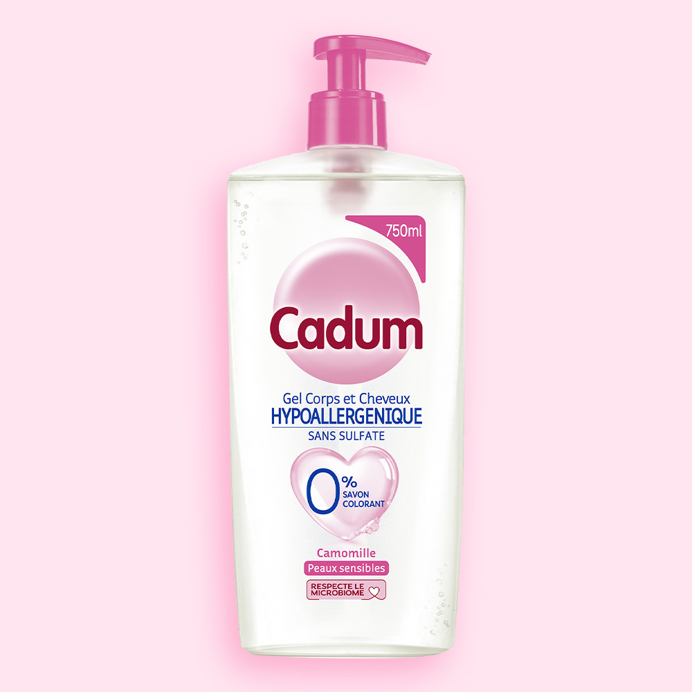 - Cadum, spécialiste de la douceur depuis 1907, a mis tout son savoir-faire dans ce Gel Corps et Cheveux Hypoallergénique Sans Sulfate en sélectionnant les ingrédients essentiels pour en faire une formule très douce 0% colorant, 0% savon, sans tensioactif sulfaté mais également sans compromis sur la douceur. Sa formule au pH neutre pour la peau testée cliniquement est si douce qu'elle respecte le mécanisme naturel des peaux sensibles, préserve votre microbiome et vous apporte confort et hydratation. Ce gel 2 en 1 au doux parfum de camomille permet de laver le corps et les cheveux en un seul geste ! Tolérance testée sous contrôle dermatologique. Testé sur les peaux de la famille.